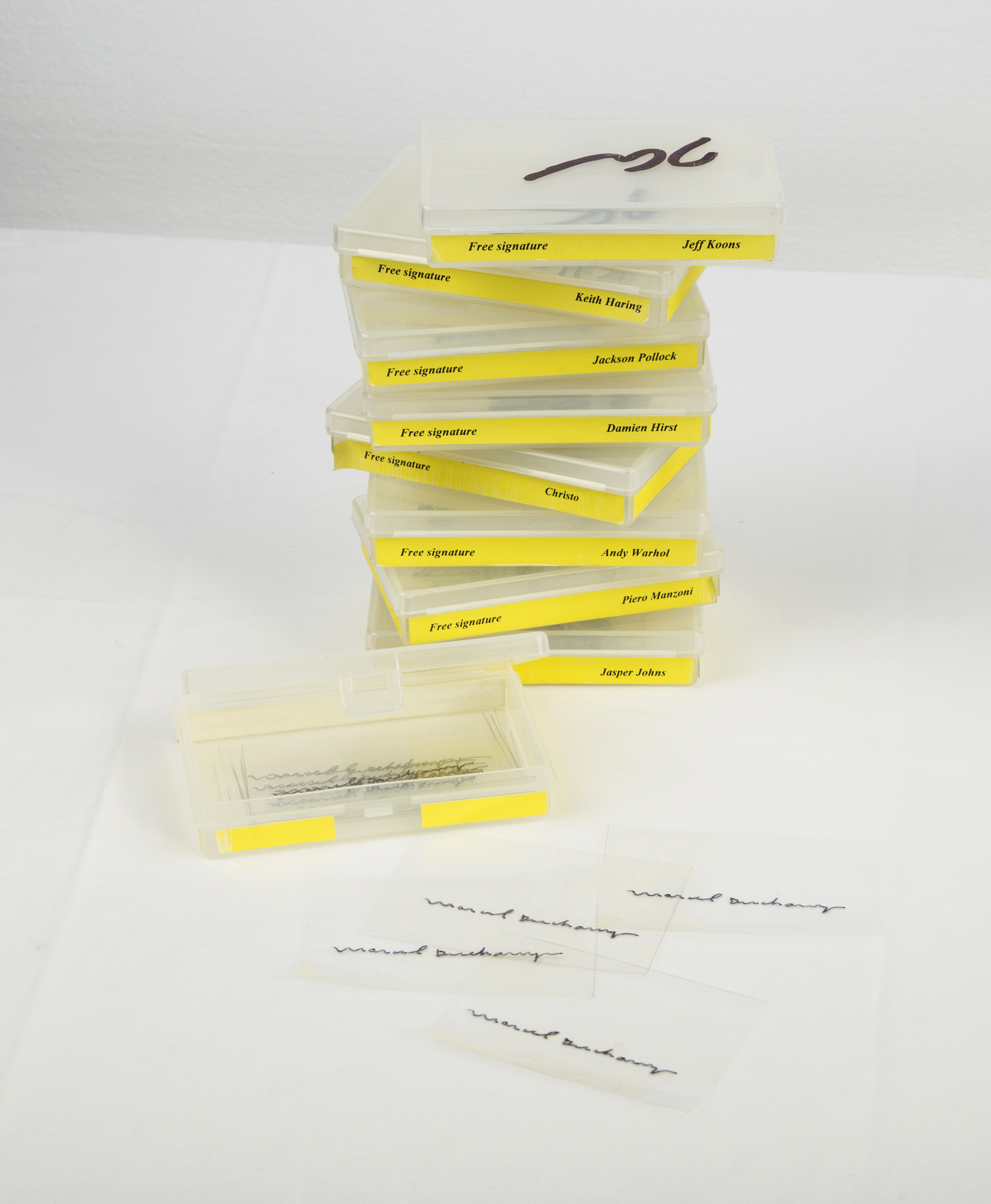 The artist’s signature can turn a simple object into an artwork or, in its absence, can deprice the object of its opera status. Free Signature is a collection of artist’s signatures, in packages of 20 pieces, that allows the consumer to feel concretely the transformation.
