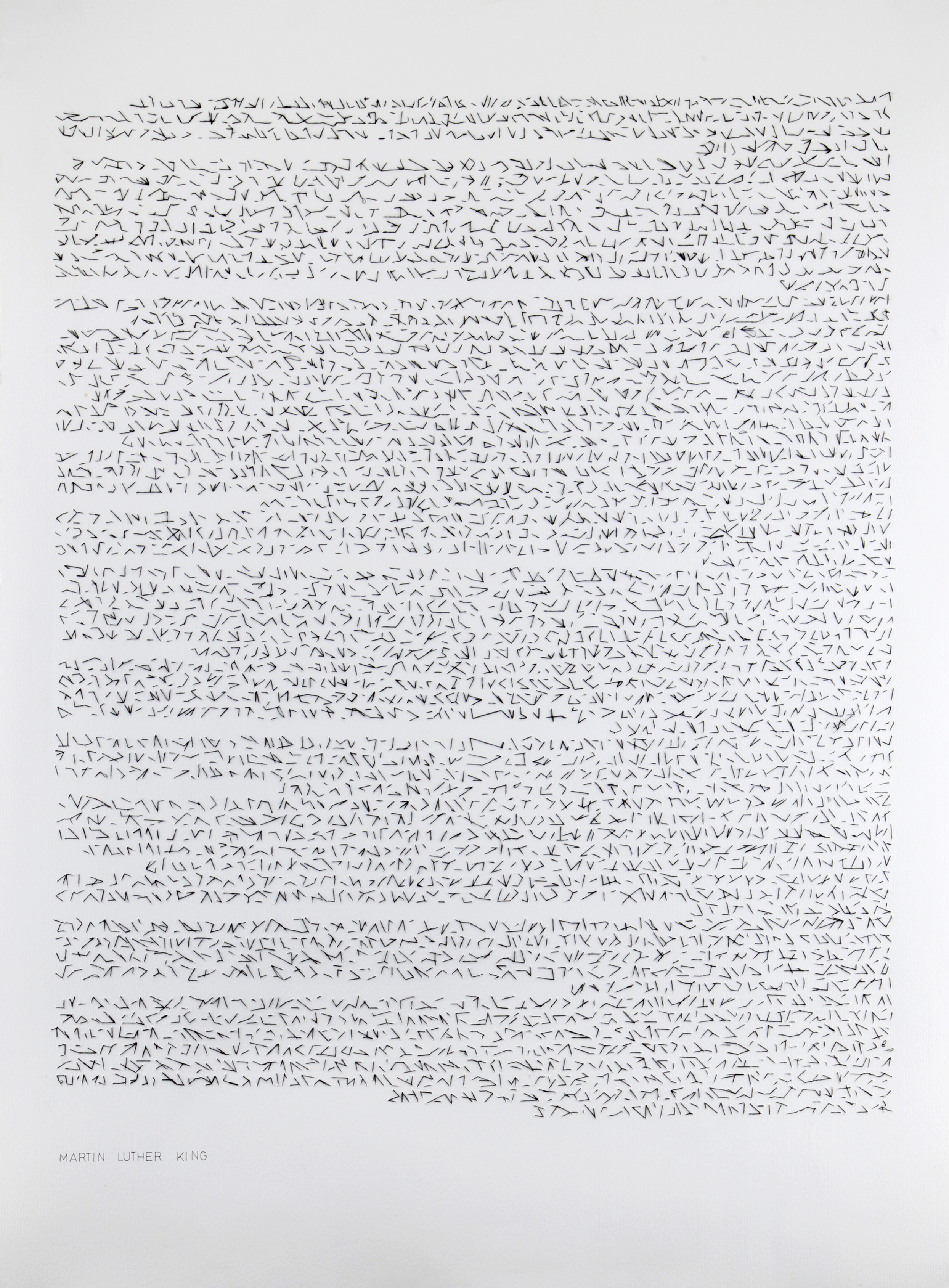 Le parole dei più celebri discorsi di pace della storia sono state cucite, segnando e delimitando lo spazio che occupano.